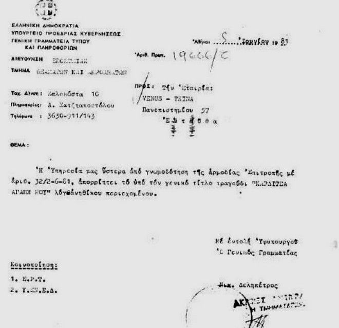 Δεν είχαν περάσει πολλά χρόνια από την εποχή της χούντας και η λογοκρισία συνέχιζε να χτυπά κάθε μορφή τέχνης. Οι μηχανισμοί ελέγχου ήταν βαθιά ριζωμένοι στην ελληνική κοινωνία που δύσκολα αποδεχόταν οτιδήποτε αντισυμβατικό. Ο πρώτος δίσκος των Μουσικών Ταξιαρχιών τάραξε τα νερά το 1982. Σε δύο μήνες πούλησε 40.000 αντίτυπα. Ο εισαγγελέας όμως παρενέβη και έδωσε εντολή να κατασχεθεί.