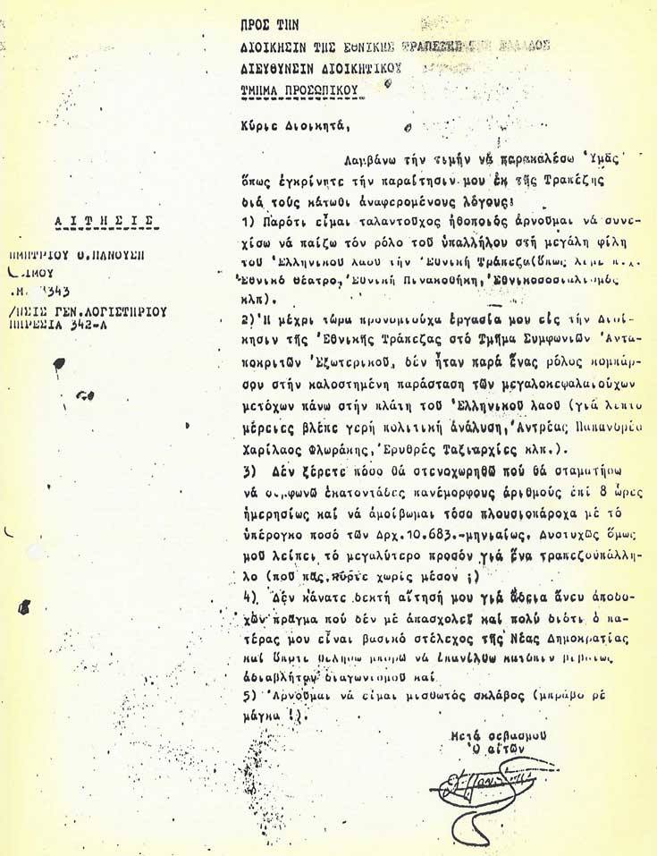 Εδώ αρχίζει η ιστορία του Τζίμη Πανούση…το 1973 βρήκε από αγγελία δουλειά σε περιοδεύοντα θίασο. Στη συνέχεια εγκατέλειψε το θίασο για να δουλέψει ως υπάλληλος στην Εθνική Τράπεζα από την οποία παραιτήθηκε γρήγορα.