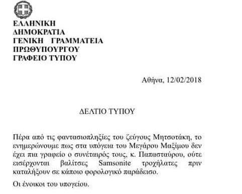 Διαβάζω την ανακοίνωση που εξεδόθη από το Γραφείο Τύπου του Πρωθυπουργού. Λέξεις που γράφτηκαν και βγήκαν μέσα από το ισχυρότερο γραφείο της χώρας. Πρόκειται για μία απάντηση προς τον Κυριάκο Μητσοτάκη. «Πέρα από τις φαντασιοπληξίες του ζεύγους Μητσοτάκη, το ενημερώνουμε πως στα υπόγεια του Μεγάρου Μαξίμου δεν έχει πια γραφείο ο συνεταίρος τους κ. Παπασταύρου, ούτε εισέρχονται βαλίτσες Samsonite τροχήλατες πριν καταλήξουν σε κάποιο φορολογικό παράδεισο. Οι ένοικοι του υπογείου».