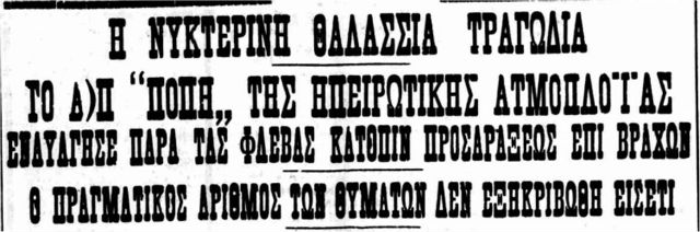 Παρότι το πλοίο ουδέποτε βυθίστηκε ολόκληρο, έντεκα επιβάτες πνίγηκαν από τον πανικό που επικράτησε. Τρεις χωροφύλακες που βρέθηκαν να συνοδεύουν κρατουμένους στην Ανάφη, άναψαν κλεφτοφάναρα με τα οποία ο κόσμος κατάφερε να δει και να διασωθεί. Αρκούσε μια οδηγία και μόνο για να εξέλθουν οι επιβάτες και να αποβιβαστούν στην κυριολεξία περπατώντας απλά στη διπλανή στεριά της βραχονησίδας του “Κασιδιού”. Να σημειωθεί πως το ατμόπλοιο “Πόπη” δεν διέθετε συσκευή ασύρματου τηλέγραφου. Η προσάραξη του πλοίου, μεταξύ άλλων προκάλεσε και την έντονη διαμαρτυρία του Συνδέσμου Ραδιοτηλεγραφητών οι οποίοι εξέδωσαν διαμαρτυρία “δια τα όσα συνέβησαν με το Α/Π “Πόπην” κύρια όμως για το γεγονός ότι τα ακτοπλοϊκά σκάφη μέχρι τότε δεν έφεραν ασύρματο τηλέγραφο.