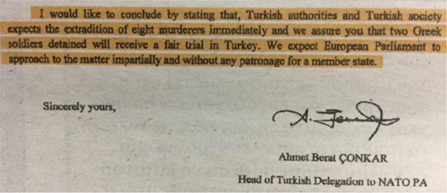 «Οι Αρχές της Τουρκίας και η τουρκική κοινωνία περιμένουν την έκδοση των οκτώ δολοφόνων άμεσα και σας διαβεβαιώνουμε ότι οι δύο κρατούμενοι έλληνες στρατιώτες θα έχουν μια δίκαιη δίκη στη Τουρκία».
