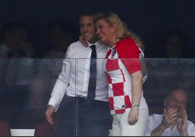 Ο πρόεδρος της Γαλλίας, Εμανουέλ Μακρόν, και η ομόλογός του της Κροατίας, Κολίντα Γκραμπάρ – Κιτάροβιτς, και οι ίδιοι εκεί για να παρακολουθήσουν τον μεγάλο τελικό.