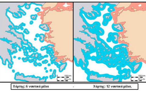 Τα χωρικά ύδατα της Ελλάδας με τα 6 ν.μ. (σημερινό καθεστώς) και μετά την επέκταση τους στα 12 ν.μ.