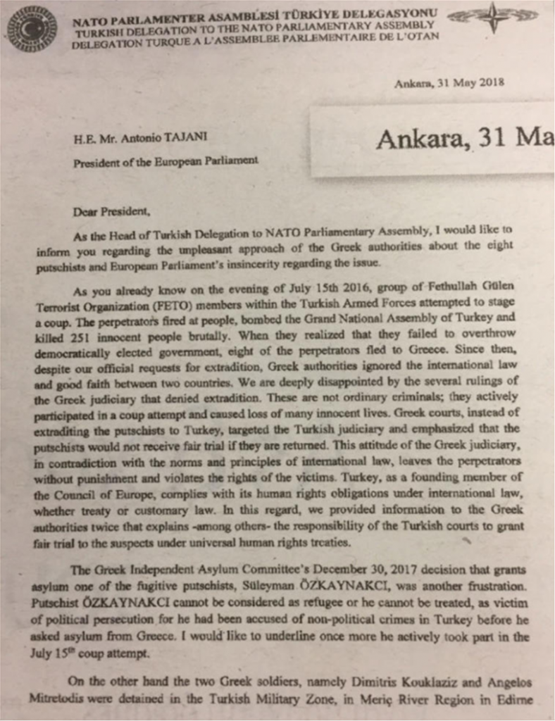 Κάθε όριο προκλητικότητας φαίνεται να ξεπερνά πλέον η Τουρκία, αφού με επίσημη επιστολή προς τον πρόεδρο του ευρωπαϊκού κοινοβουλίου Αντόνιο Ταγιάνι όχι μόνο συνδέει την υπόθεση των οκτώ Τούρκων αξιωματικών με τους δύο Έλληνες στρατιωτικούς, αλλά ζητεί από την Ελλάδα πρώτα να εκδώσει τους Τούρκους αξιωματικούς και τότε, όπως αναφέρει χαρακτηριστικά, δεν θα προχωρήσει στην απελευθέρωση των Ελλήνων αλλά… διαβεβαιώνει «πως θα έχουν μία δίκαιη δίκη».
