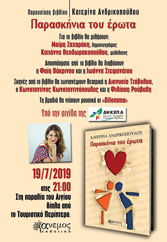 Η Κατερίνα Ανδρικοπούλου και η Άνεμος εκδοτική θα πραγματοποιήσουν την παρουσίαση του 2ου βιβλίου της συγγραφέως με τίτλο «Παρασκήνια του έρωτα», την Παρασκευή 19 Ιουλίου στις 9 το βράδυ στην παραλία Αιγίου, δίπλα στο Τουριστικό.