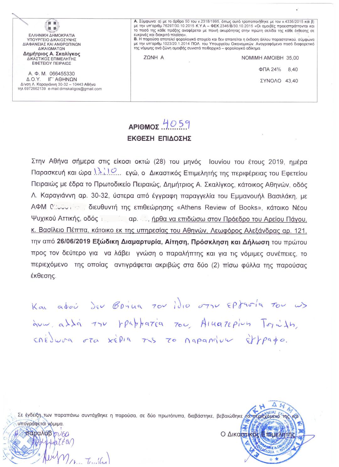 Βασίλειο Πέππα, Πρόεδρο του Αρείου Πάγου, κάτοικο ως εκ της υπηρεσίας του Αθηνών (Λεωφόρος Αλεξάνδρας αρ. 121).