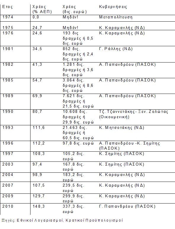 Εξέλιξη του δημόσιου χρέους (1974-2018) με τους «μπουρλουτιέρηδες» πρωθυπουργούς ( βλέπε πίνακα)